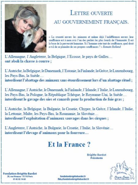 Dans sa lettre ouverte, Brigitte Bardot cite les pays européens qui ont interdit la chasse à courre, l’abattage des animaux sans étourdissement, le gavage des oies et des canards, l’exploitation des animaux dans les cirques et l’élevage pour la fourrure.